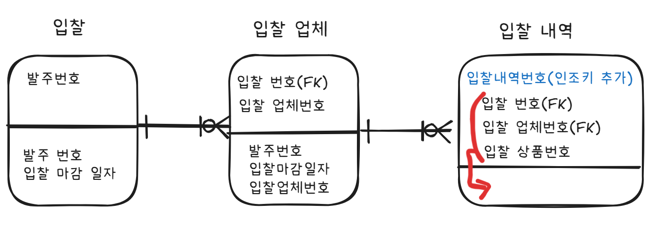 - 기존 PK(기존 엔티티 속성 및 FK)를 NOT NULL로 내리고, 인조키 추가