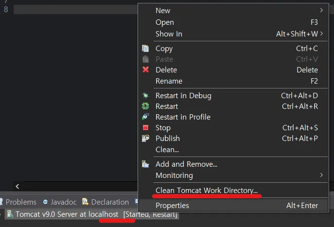 방법 2) Servers 탭 우클릭 > Clean Tomcat Work Directory